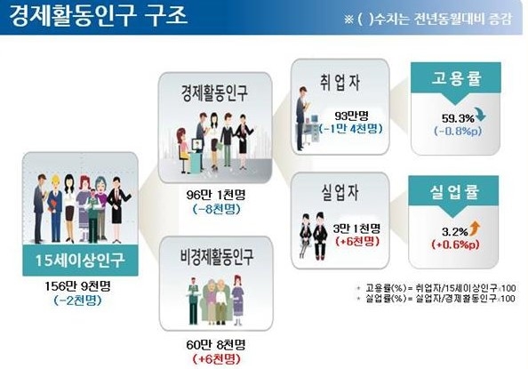 경제활동인구는 96만1000명으로 지난해 같은 기간보다 8000명(-0.8%) 줄었고, 경제활동참가율은 61.2%로 전년동월대비 0.5%p 하락했다.