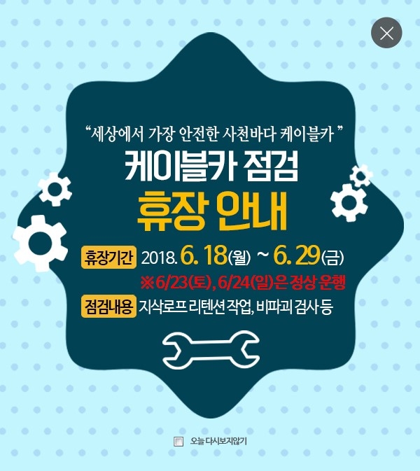 사천시시설관리공단은 사천바다케이블카 점검에 따라 오는 6월 18일부터 29일까지 2주간 임시 휴장에 들어간다고 밝혔다.