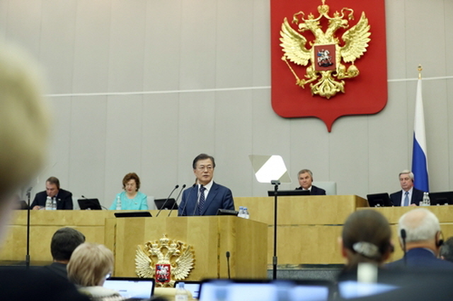 문 대통령은 앞서 러시아 도착 후 첫 일정이었던 하원 연설에서는 "한반도에 평화체제가 구축되면 남북 경제협력이 본격화될 것이며 러시아와의 3각 협력으로 확대될 것"임을 강조했다.