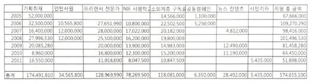 또 각 항목은 년도 별로 지원 받았던 내역이 다른 가운데 ‘기획취재’ 와 ‘소외계층구독료’ 부분은 7년 간 매년 받았으며, 프리랜서 전문가 부분도 지난 2006년부터 2011년까지 6년간 받았다.
