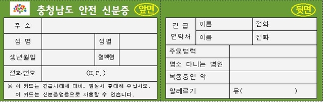 충남도가 지진, 홍수, 대형사고 등 대규모 재난사고로 위급 상황 발생 시 골든타임을 확보하고자 안전신분증 제도를 마련해 범도민 휴대운동을 전개한다.