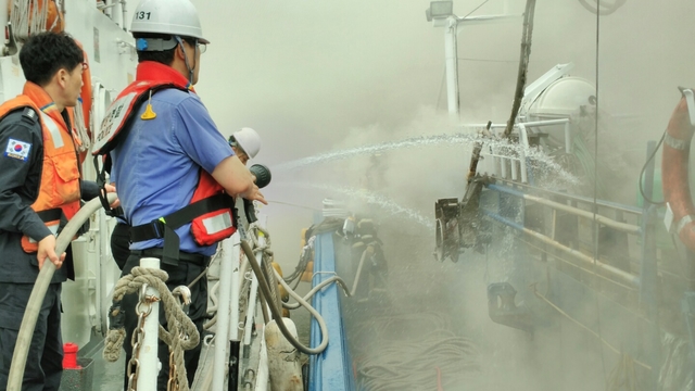 ▲여수해경이 화재선박 소화 작업중이다. ⓒ여수해양경찰서