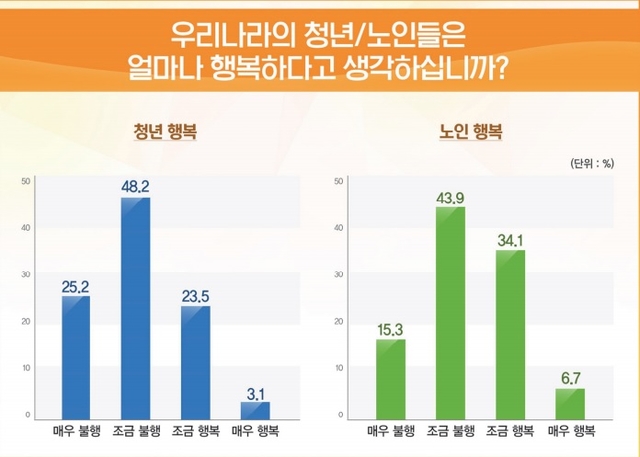 우리 사회에서 가장 빈곤한 연령층으로 꼽히는 청년층과 노인층 모두 불행하다는 인식이 팽배했음을 보여주는 결과다.