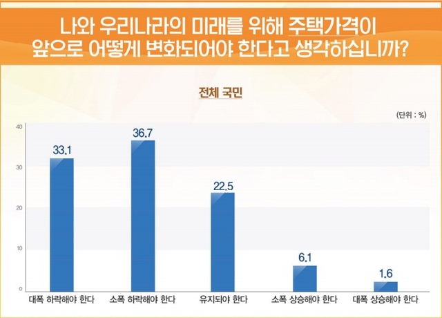 '나와 한국의 미래를 위해 주택가격이 앞으로 어떻게 변해야 한다고 생각하느냐'는 질문에 응답자의 33.1%가 '대폭 하락해야 한다'고 답했다. '소폭 하락해야 한다'고 답한 이도 36.7%였다.