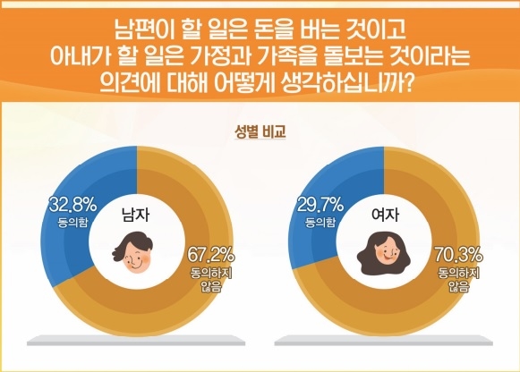 '남편이 할 일은 돈을 버는 것이고 아내가 할 일은 가정과 가족을 돌보는 것'이라는 의견에 여성의 70.3%가 동의하지 않았고, 남성의 67.2%도 동의하지 않았다.