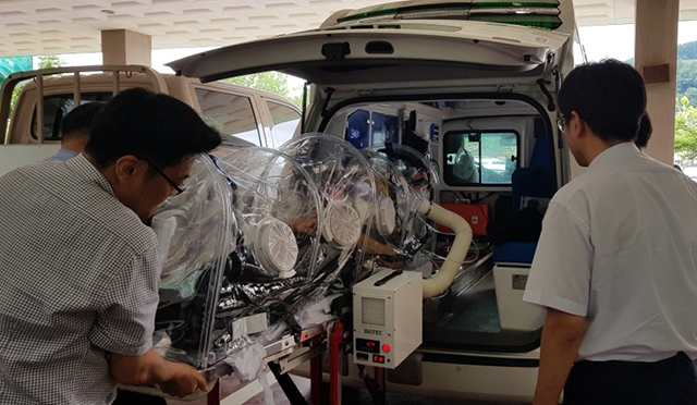 음압장비 환자 이송장치는 메르스 등 호흡기 감염환자 또는 의심환자 이송 시 의료인을 보호하고 접촉자 감염으로 인한 지역사회 확산 방지를 위한 장치다.