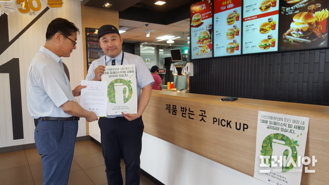 매장 내 플라스틱 1회용 컵 사용 시 계고장을 발부해 사용 금지를 촉구하고, 매장 내 1회용 컵 사용금지 안내 홍보물 등을 배부한다.