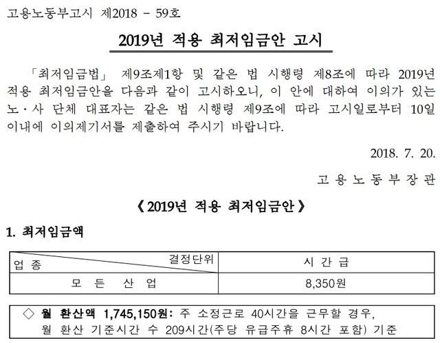 이날 고용노동부는 '2019년 적용 최저임금안 고시'를 통해 내년 1월 1일부로 적용되는 최저임금을 시간당 8350원(주 40시간, 주당 유급주휴 8시간 기준 월 174만5150원)으로 고시했다.