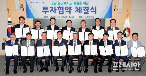 24일 경남도청 도정회의실에서 김경수 도지사와 한정우 창녕군수가 참여한 가운데 자동차 시동모터 생산 업체인 보그워너피디에스(유), 식품 생산 업체인 ㈜가온누리와 투자협약이 체결됐다.