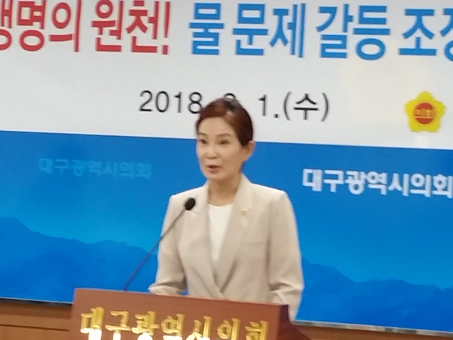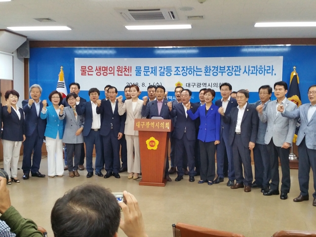 대구시의회 배지숙 의장 등 의원들은 1일 대구시의회 회의실에서 '대구 취수원과 관련한 환경부장관의 인식에 심히 우려를 표한다'는 제목의 성명서를 발표하고 김은경 환경부장관의 대구 취수원 관련 발언을 대구시민에게 사과하라고 요구했다.