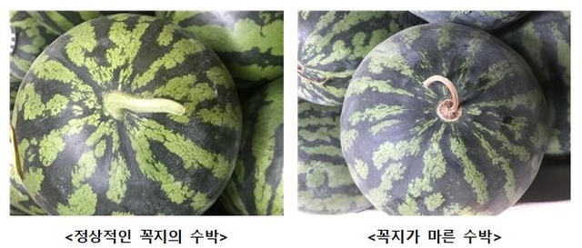 수박은 꼭지부터 수분이 마르므로 길이나 모양에 상관없이 꼭지의 상태로 신선도를 판단할 수 있다.