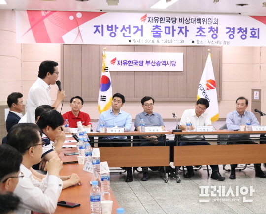 한국당 비상대책위원회는 12일 오전 11시 부산시당사 강당에서 '6.13 지방선거 부산지역 광역기초단체장 및 광역의원 출마자 초청 경청회'를 개최했다.