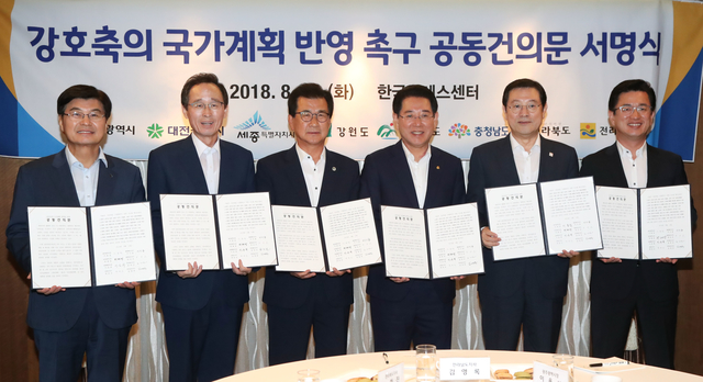 이들 8개 광역단체장들은 14일 오후 한국 프레스센터에서 모임을 갖고, 강원-충청-호남을 잇는 ‘강호축’의 개발을 국가균형발전계획과 국토종합계획 등 국가 계획에 반영할 것을 요구하는 내용의 공동건의문을 채택했다.