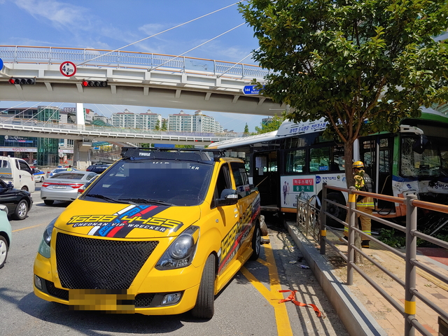 15일 오전 10시 40분쯤 천안시 불당동 원형육교 사거리에서 천안시청에서 월봉중학교 방면으로 직진하던 시내버스와 갤러리아백화점에서 쌍용동 방면으로 향하던 승용차가 충돌했다.