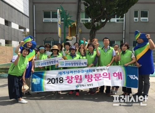 이날 캠페인에서는 현수막을 이용해 거리홍보와 시민들에게 ‘2018창원세계사격선수권대회’ 홍보물을 배포했다.