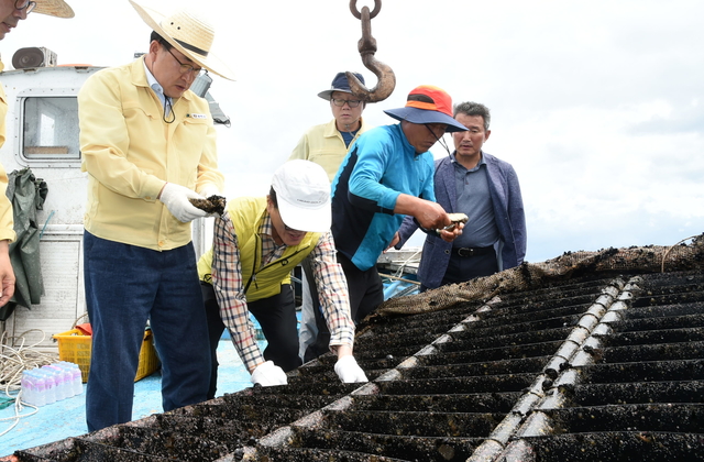 주 시장이 지난 15일 최근 지속되는 폭염으로 인해 폐사한 동해안 양식어장 전촌리 해상 현장을 방문했다.