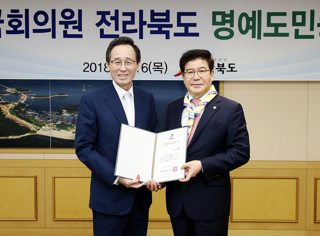 16일 전북도청 접견실에서 송하진 전북도지사는 2023 세계잼버리 새만금 유치를 성공적으로 이끄는데 기여한 자유한국당 김성태 국회의원(오른쪽)에게 전라북도 명예도민증을 수여했다.