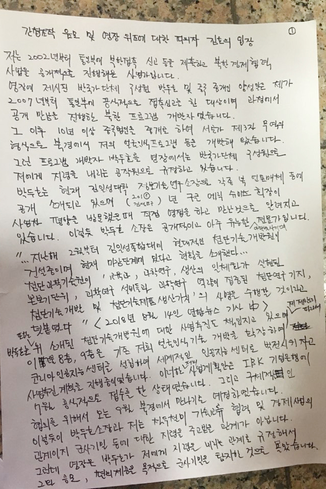 변호인단은 김 씨가 북한 기술자들과 교류를 한 것은 맞지만 비군사목적에 한정된 내용이었고, 지령을 받은 사실이 없다는 입장을 밝혔다.