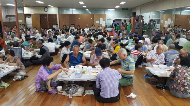 16일 말복을 맞아 부녀회는 지역 어르신 300여명에게 삼계탕 중식을 접대했다.