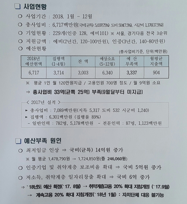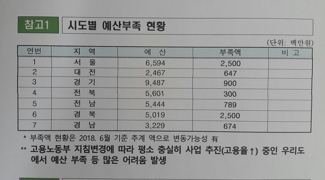 그는 또 "예산이 균형발전특별회계(균특)로 잡혀있어 도에서는 추가예산을 세울 수도 없는 실정이라 많이 답답해하고 있으며 노동부, 기재부 방문과 연락을 계속 하고 있으나 현재 쉽지 않은 상황이다"고 밝혔다.
