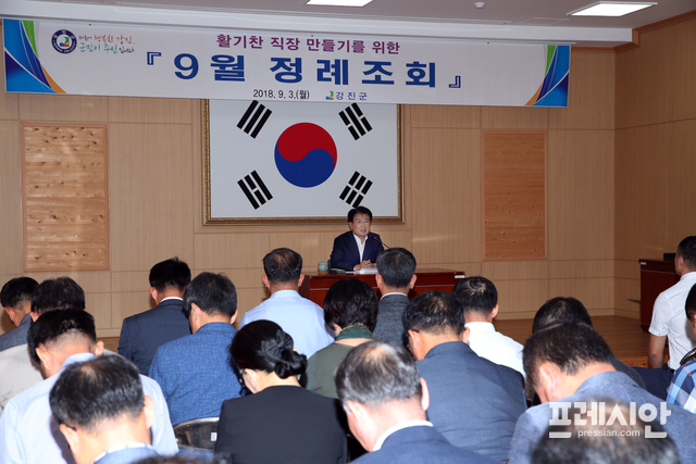 강진군은 민선 7기 출범 이후 9월 1일자로 첫 인사 및 조직개편을 단행한 후 첫 정례조회를 지난 3일 군청 대회의실에서 개최했다고 5일 밝혔다.