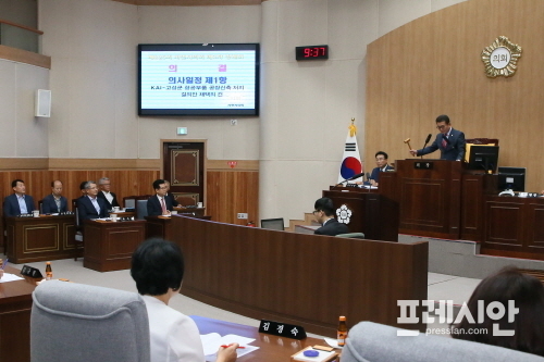 사천시의회는 6일 제225회 사천시의회 제1차 정례회에서 8월 31일 구정화(자유 한국 당, 가선 거구) 의원이 대표 발의한 ‘KAI-고성군 항공부품 공장 신축 저지 결의안’을 만장일치로 채택했다.