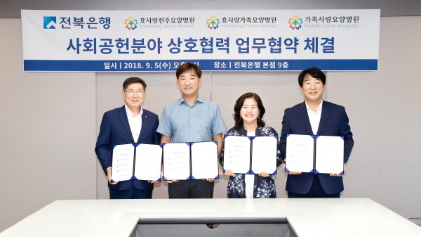 이번 협약식을 통해 전북은행과 효사랑전주요양병원 등은 각 사에서 실시하고 있는 사회공헌사업 공동참여, 사회공헌 담당부서 정기적 상호교류 실시, 나눔 문화 확산을 위한 상호협력관계 구축을 약속했다.