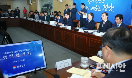 김경수 경남지사는 10일 도청 도정회의실에서 내년도 국고예산 확보와 현안사업 지원방안을 논의하기 위해 자유한국당 경남도당과 민선 7기 첫 정책협의회를 개최했다.