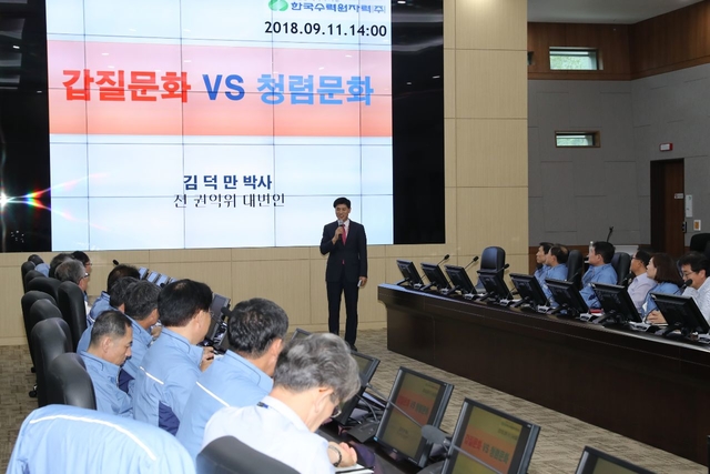 한국수력원자력(사장 정재훈, 이하 한수원)은 지난 11일 청렴윤리연구원장 김덕만 원장(전 권익위원회 대변인)을 초빙해 ‘갑질 방지와 청렴문화 확산’이란 주제로 청렴교육을 시행했다. 이날 교육에는 정재훈 한수원 사장을 비롯해 남주성 상임감사위원, 본부장 및 본사 처·실장 등이 참석했다.