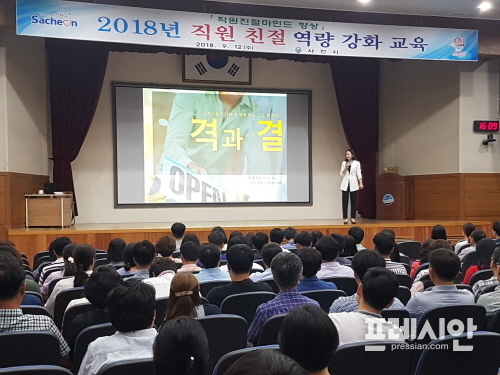 경남 사천시는 민선 7기 출범 시정사표 ‘시민중심 명품도시 구현’을 위해 시민을 먼저 생각하는 고객 맞춤형 공무원 친절 의식 향상을 위해 시청 대강당에서 직원 400여 명을 대상으로 공무원 친절역량 강화 교육을 했다.