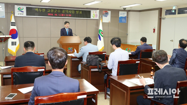 백두현 경남 고성군수는 1일 군청 중회의실에서 새로운 도약으로 희망찬 고성 실현을 위한 핵심정책인 공약사업에 대하여 7개 분야 69개 세부사업을 추진할 것을 발표했다.