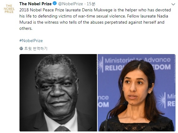 노르웨이 노벨위원회는 5일(현지시간) 무퀘게와 무라드를 2018년 노벨평화상 수상자로 선정했다고 발표했다.