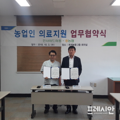 농협 하동군지부는 화개농협 소회의실에서 의료서비스 낙후지역 농업인과 소외계층의 의료혜택 제공을 위해 인사이드 하동 봉사단과 ‘하동군 농업인 의료지원 업무 협약식’을 가졌다고 7일 밝혔다.
