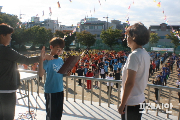 6학년 송지호 학생회장이 "규칙을 지키며 정정 당당히 경기에 임하고, 서로서로 아끼고, 배려하면서 즐거운 마음으로 참여할 것"을 선서하고 있다.ⓒ송부성 기자