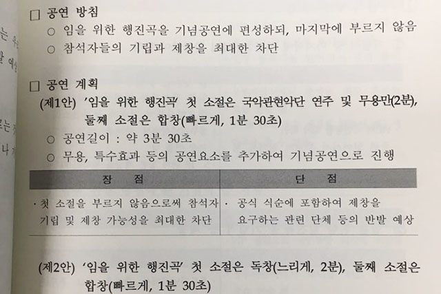 공연계획안에 제시된 1안은 '첫 소절은 연주 및 무용만(2분), 둘째 소절은 합창(빠르게, 1분 30초)'이다. 보훈처는 이에 대한 장점으로 '첫 소절을 따라부르지 않게 함으로써 참석자 기립 및 제창 가능성을 최대한 차단'으로 꼽는다. 2안은 '첫 소절은 독창(느리게, 2분), 둘째 소절은 합창(빠르게, 1분 30초)이다. 이에 대한 장점 또한 "공연 형식으로 진행해 참석자의 기립을 어느 정도 방지할 수 있다"는 것이다.