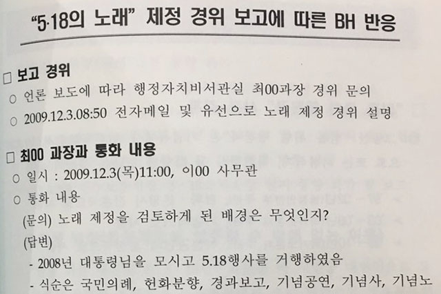 2009년 12월 3일 청와대 의전비서관실 이모 사무관은 보훈처에 행사 때 노래가 불리게 된 경위 등을 물었다. 이에 이모 사무관은 "5.18 단체의 의견도 중요하지만 현재의 사회 여론도 매우 중요하며 노래 제정은 여론을 감안해 신중하게 접근할 필요가 있다"고 했다.