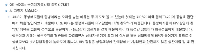 물론 이 답변도 완전하지 않다. "동성 간 성 행태가 항문성교이기 때문"이라고 규정한 것도 성이 '취향'이라는 기본적인 전제를 무시한 것이다. 그러나 최소한 질병관리본부는 '동성애=에이즈' 도식은 '틀렸다'고 지적한다.