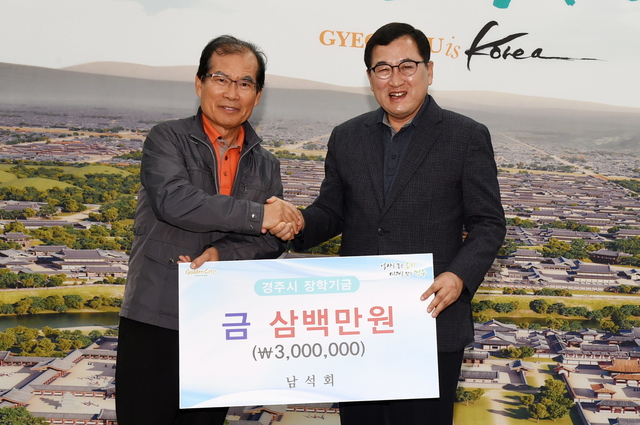 재대구 경주 출향단체인 남석회(회장 백재환)는 13일 고향 경주를 찾아 지역 인재 육성에 써달라며 장학금 300만원을 경주시장학회에 기탁했다.