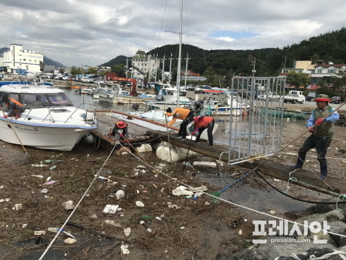 이번 태풍 및 호우로 해안변에 유입된 부유쓰레기는 90%가 초목류이고 나머지는 스티로폼 및 생활쓰레기이다.