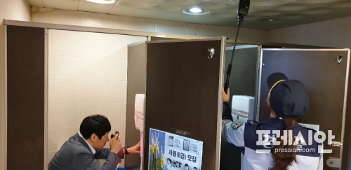 경남 사천시는 공중화장실 내 범죄예방을 위해 사천경찰서와 합동으로 공중화장실 20개소에 대한 몰래카메라 점검을 했다.