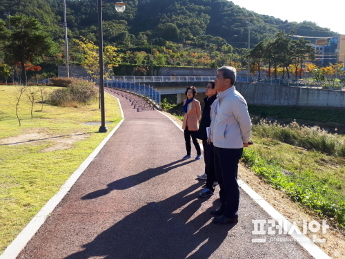 장 구청장은 현동 주민들이 많이 찾고 있은 우산천 일대를 둘러보며 산책로 이상여부, 시설물 안전여부 등을 점검했다.