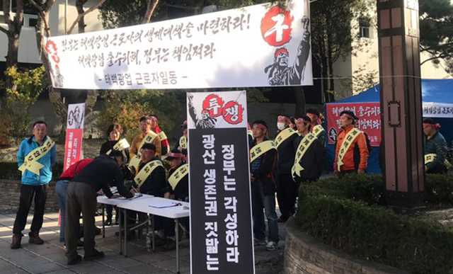 ▲태백 황지연못에서 태백광업 광부들이 출수피해 대책을 호소하고 있다. ⓒ프레시안