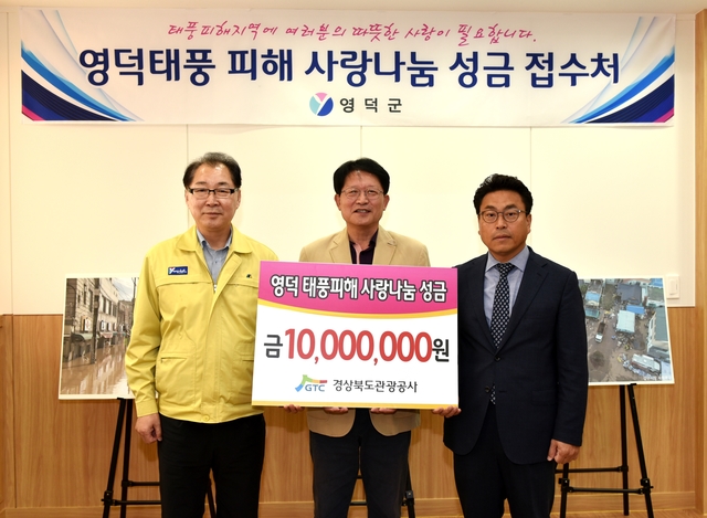 경상북도관광공사(이하 관광공사)은 19일 태풍‘콩레이’로 큰 피해를 입은 영덕군 주민들을 돕기 위해 모금한 성금 1,000만원을 영덕군에 전달했다.