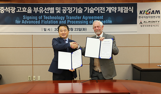 한국지질자원연구원(원장 김복철)과 세계적 텅스텐 광산인 알몬티 대한중석(대표이사 루이스 블랙)은 23일 대전 지질자원연구원에서 상동광산 개발을 위한 선광기술 특허 및 노하우에 대한 기술이전계약을 체결했다.