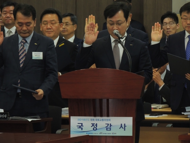 ▲국회 국토교통위의 한국철도공사에 대한 국정감사에서 오영식 사장이 증인선서를 하고 있다. ⓒ육심무 기자