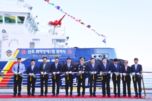 여수해양경찰서에 따르면 24일 오전 10시 여수 신항 전용부두에서 최초 500톤급 화학방제2함 취역식 행사를 개최했다.