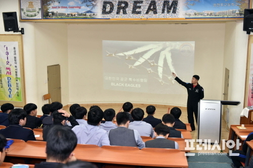 이날 강의는 블랙이글스 조종사인 김윤태, 최근호 대위가 맡고, 조종사가 어떤 활동을 하는지, 그리고 공군 조종사가 되기 위해서는 어떤 준비 과정을 거쳐야 하고 공군 중에서 최고의 조종사인 블랙이글스 팀원이 되기 위해서는 어떠한 과정을 거쳐야 하는지에 대해 자세히 설명하여 학생들에게 뜨거운 호응을 받았다.