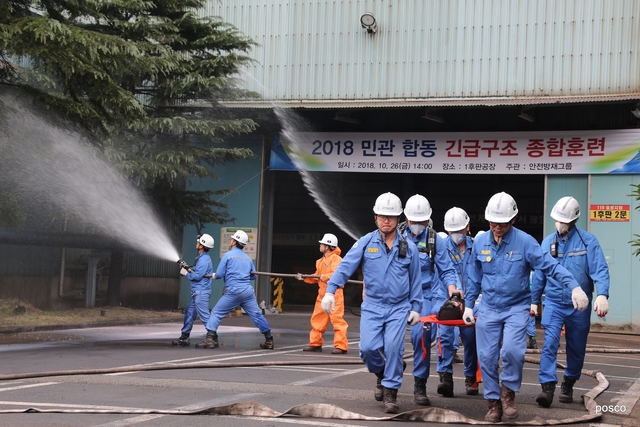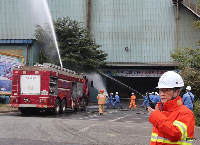 포항제철소 1후판공장에서 실시된 이번 훈련에는 오형수 포항제철소장, 한완수 포항남부소방서장을 비롯해 포항제철소 방재섹션, 소방관, 해군, 경찰 등 90여 명이 참여했다.