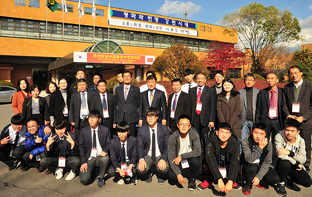 ▲29일 태백시청에서 중국 강서성 가오안중학교 방문단과 류태호 태백시장을 비롯한 황지고 관계자 등과 기념촬영하고 있다. ⓒ태백시