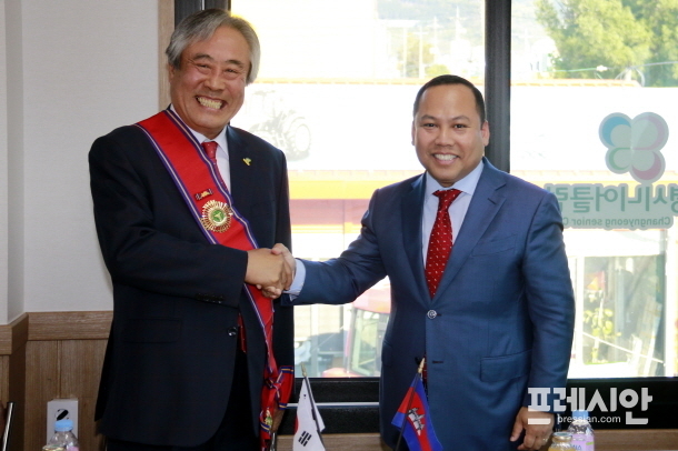주한 캄보디아 롱 디멘체 대사는 31일 오후 창녕군 소재 (사)행복 드림 후원회 사무실을 방문해 캄보디아 왕실이 외국인에게 수여하는 최고 훈장인 ‘모하넷’을 김삼수 회장에게 전달했다.